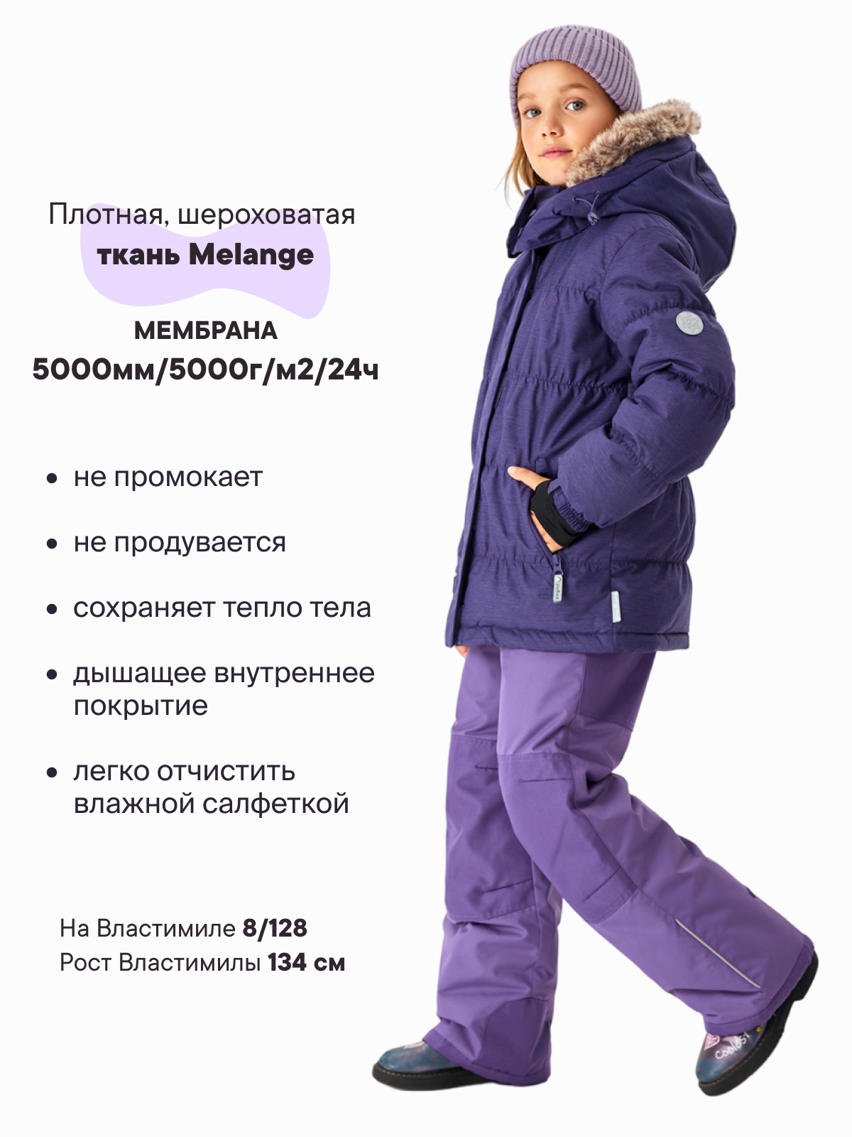 Теплый комплект отлично подойдет для холодной осени и морозной зимы. Мембранная ткань защитит от дождя и ветра, имеет грязеотталкивающий эффект. Стильный дизайн поможет выделиться в толпе, как малышу, так и девочке подростку.