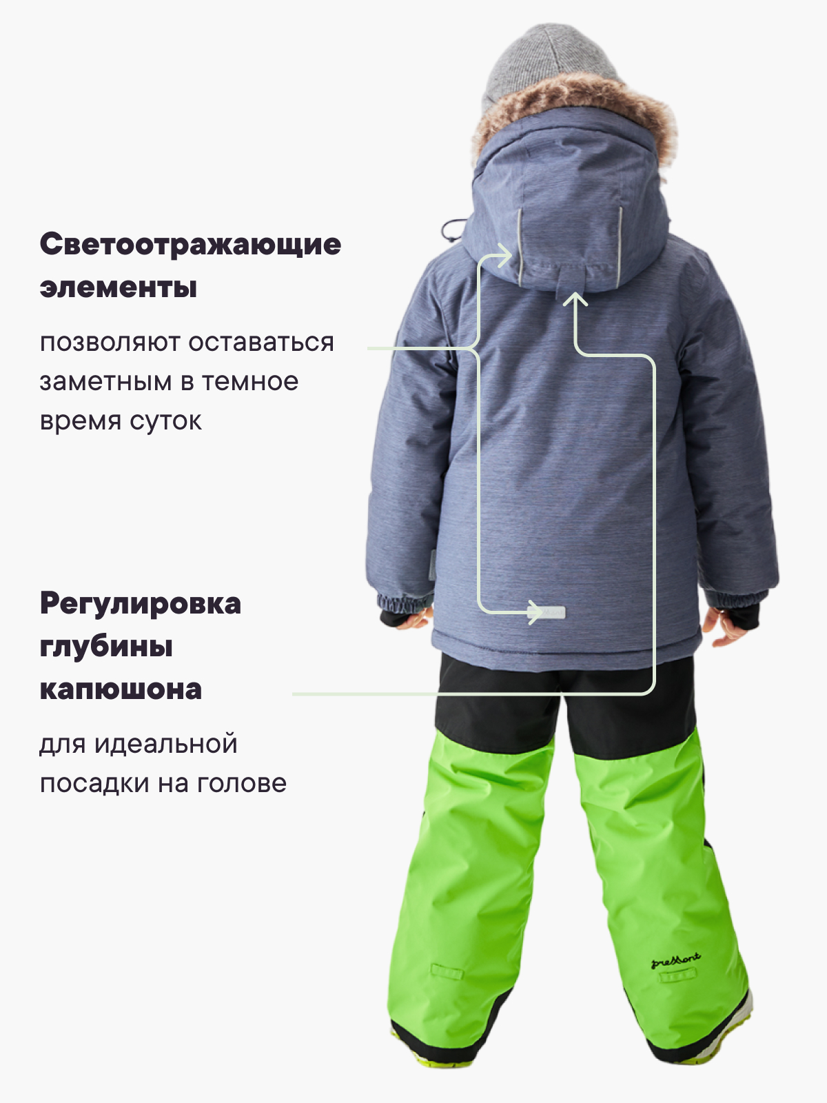 Теплый комплект отлично подойдет для холодной осени и морозной зимы. Мембранная ткань защитит от дождя и ветра, имеет грязеотталкивающий эффект. Стильный дизайн поможет выделиться в толпе, как малышу, так и мальчику подростку.