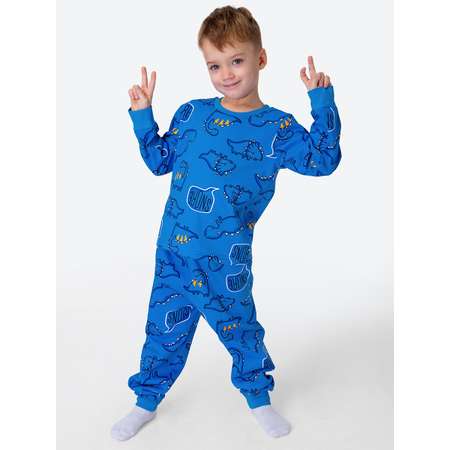 Теплая детская пижама с брюками для мальчиков выполнена из 100% хлопка. Пижама из футера с начесом станет любимым атрибутом отдыха благодаря свободному крою и насыщенному синему цвету. Прикольный принт Динозавры поднимает настроение и создает уютную атмосферу.