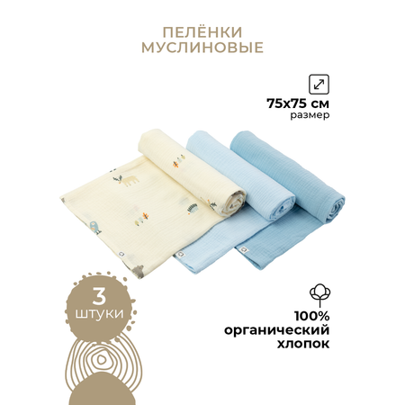 Пеленки муслиновые 3 шт BUBA KIDS Таежная ночь/ нежно-голубой/ синяя пастель 75х75 см
