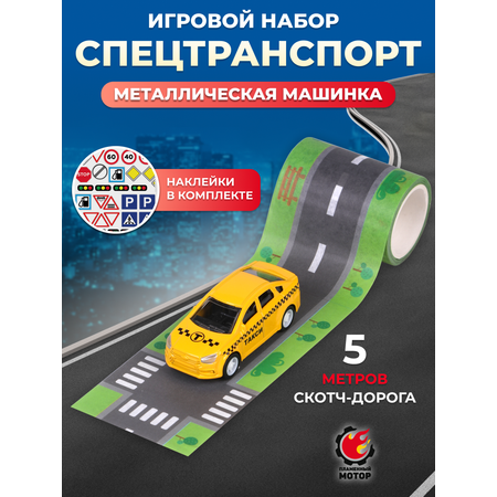 Игровой набор для детей включает в себя металлическую машинку такси с инерционным механизмом, бумажную скотч-дорогу длиной 5 метров и стикеры с дорожными знаками. Такой набор станет отличным подарком в день рождения, на Новый год или к 23 февраля для мальчика или первоклассника, а также для детей 1, 2, 3 года, 4, 5, 6, 7 лет. С помощью набора можно создавать свою автомобильную трассу на любой ровной поверхности, не боясь испортить покрытие: скотч-дорога не оставляет следов после отклеивания, в отличие от обычного скотча, и подходит для игр дома, в садике или даже в школе. Реалистично выполненная игрушечная металлическая машинка помогает изучать правила дорожного движения (ПДД) в игровой форме. Просто разместите игрушку на дороге, слегка отведите назад и отпустите — инерционный механизм позволит автомобилю самостоятельно двигаться вперед.