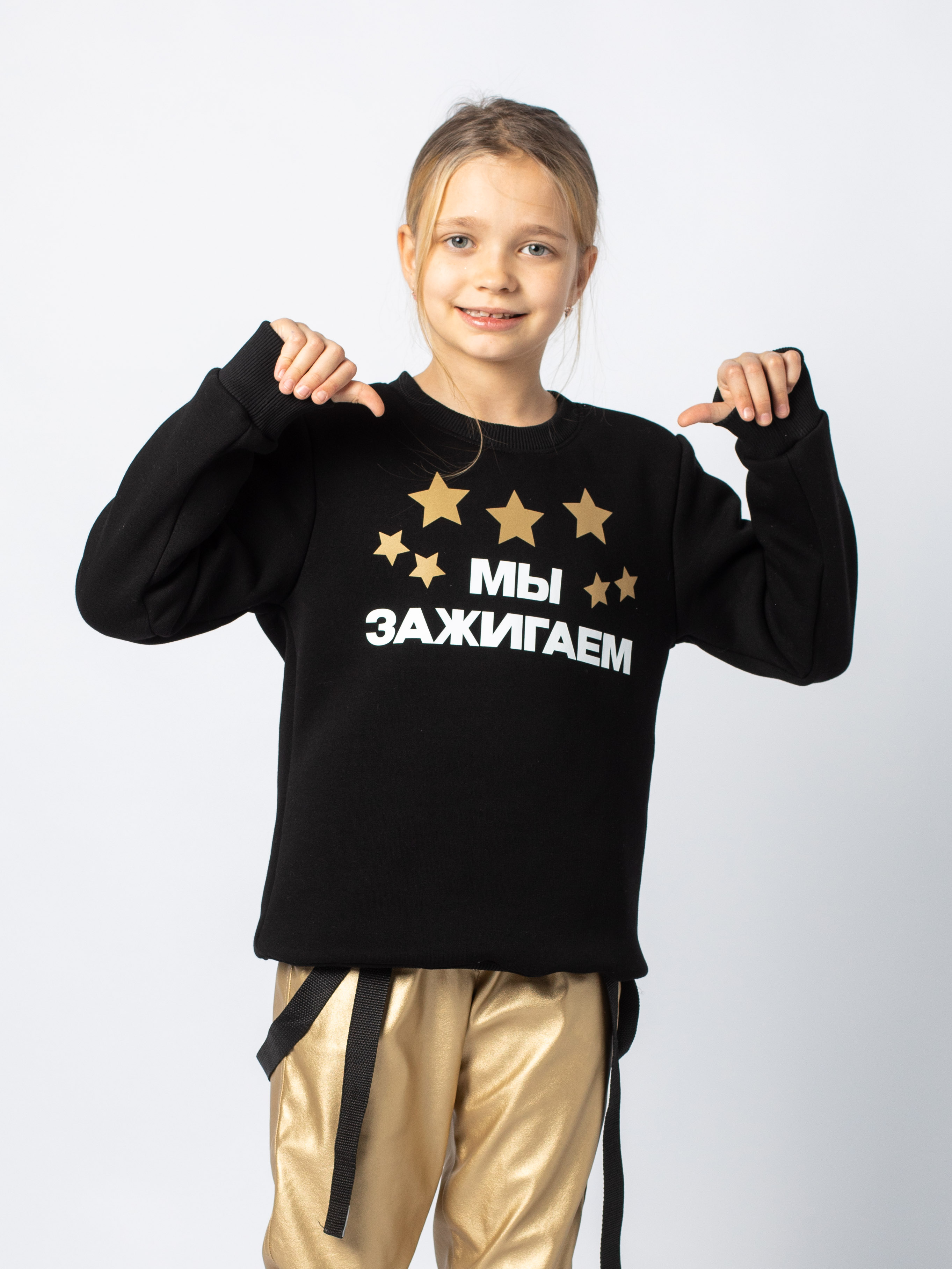 Свитшот для девочек, с надписью Мы зажигаем. Материал футер с начесом. На рукавах манжеты, горловина округлая.