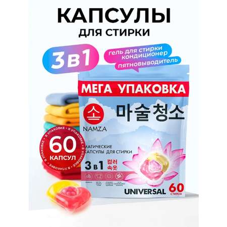 Капсулы для стирки белья 3 в 1 NAMZA универсальные это жидкое средство для стирки в капсулах. Капсулы с кондиционером, гелем и пятновыводителем. Подходят для цветного, белого и черного и для всех типв белья. Капсулы для стирки белья – это настоящая революция в области ухода за одеждой.