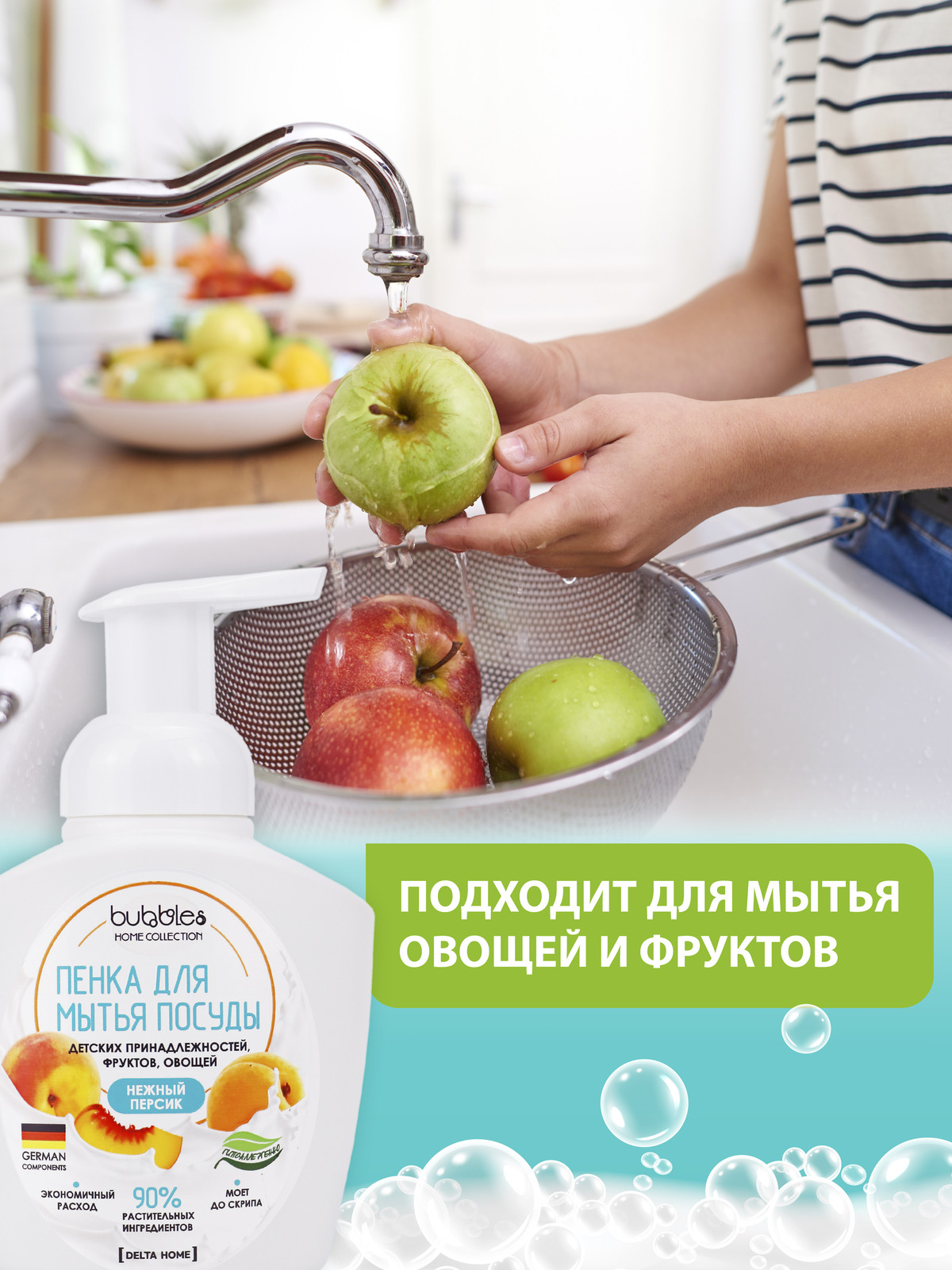 Bubbles Нежный персик 400 мл. Средство для мытья посуды с нежным ароматом персика на 90 % состоит из растительных ингредиентов, хорошо пенится, моет посуду до скрипа. Пенный дозатор делает расход геля очень экономным. Одна бутылочка пенки для мытья посуды заменит 3 бутылки обычного средства. Пенка для мытья посуды отлично смывается с поверхности, безопасна и не оставляет запаха. Гель гипоаллергенный, подходит для мытья овощей, фруктов детской посуды бутылочек, сосок, игрушек. Не содержит SLS, парабенов, силиконов, минеральных масел и красителей. Не сушит кожу рук, не вызывает аллергии. Попробуйте и другие продукты от Bubbles детская пена для ванны меняющая цвет Mama Mila и жидкое мыло для рук в форме нежной пенки с ароматами лимонного десерта и сливочного пломбира.Цены в интернет-магазине могут отличаться от розничных магазинов.