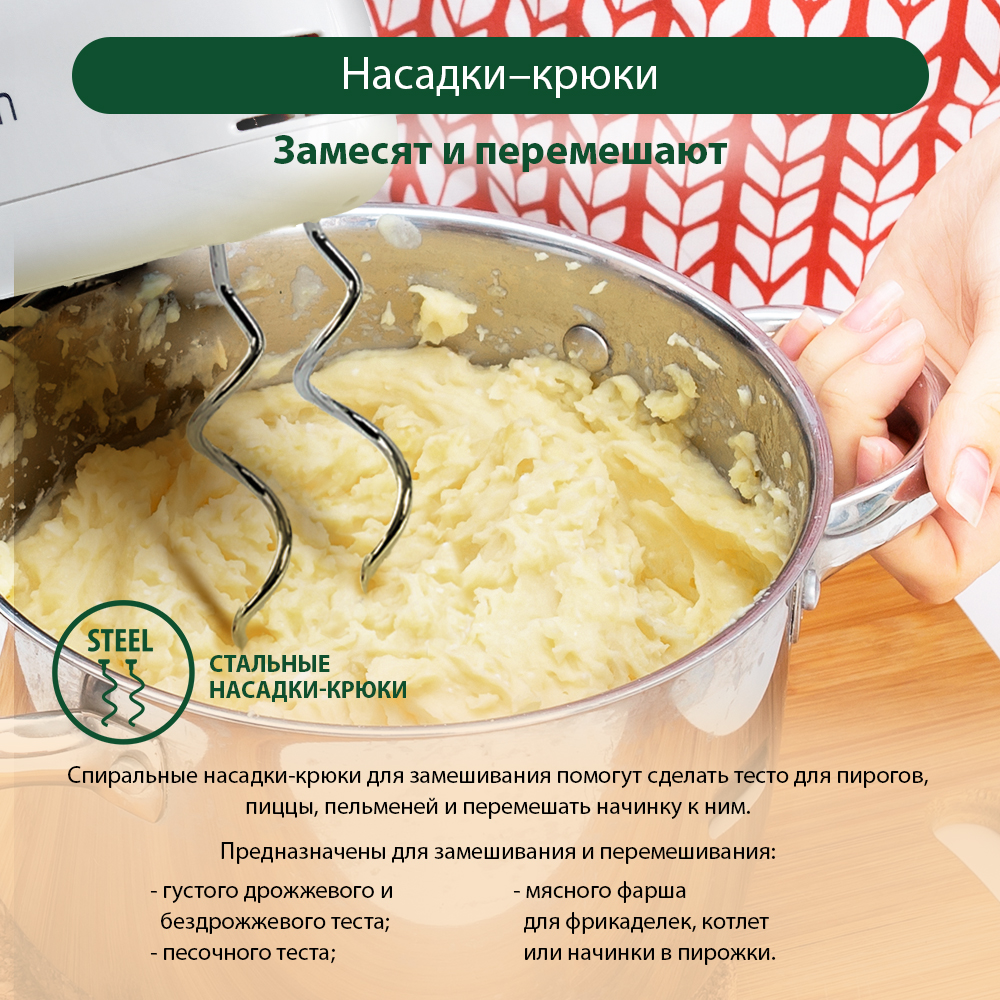 Компактный миксер с 2 комплектами насадок подходит для смешивания жидкостей, взбивания яиц или крема, приготовления пюре и замешивания теста.