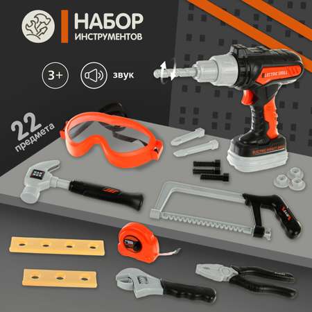 В комплекте маска, ножовка, разводной ключ, пассатижи, детский игрушечный шуруповерт с 3 насадками, отвертка с 2 насадками, молоток, рулетка, штангенциркуль, 2 элемента для скрутки, 3 болта, 3 гайки.