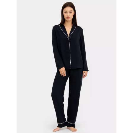 Пижама для женщин, состоящая из жакета и брюк. Модель выполнена из мягкого вискозного трикотажа. Жакет длиной до середины ягодиц, прямого силуэта, с V-образной горловиной, длинными рукавами на манжетах и немного спущенной линией плеча. По центру жакет застегивается на пуговицы. Брюки длинные, свободные, на манжетах и с эластичной резиной в поясе. Стильно и невероятно комфортно. Рекомендуем для отдыха, сна и домашних дел!