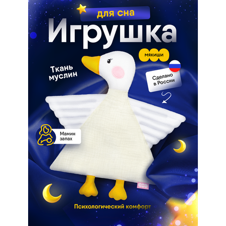 Игрушка для сна новорожденных комфортер Гусенок — это первая и самая важная игрушка для малыша. Созданная для самых сладких и крепких снов младенца, игрушка выполнена из трендового материала муслина, а крылышки из белоснежного фактурного меха. Премиальные материалы не раздражают нежную кожу малыша. Взаимодействуя с нежными тканями комфортера, ребенок осваивает важнейшие навыки самоуспокоения и учится засыпать самостоятельно. А во время бодрствования комфортер отлично подойдет для активных игр, а приятная фактура вышивки поможет в развитии тактильного интеллекта и мелкой моторики. Использовать плюшевую зверушку для новорожденных легко — ее следует носить ближе к телу и прикладывать во время кормления и укачивания. Также можно класть в кроватку, коляску или автокресло. Мягкая ткань игрушки впитает родной для малыша запах мамы, и младенец всегда будет ощущать ее присутствие. Знакомая и любимая с первых дней жизни игрушка позволит малышу успокоиться в незнакомых ситуациях — на приеме у врача, в гостях или в магазине. Открытые глаза и яркий клюв гуся вызовут интерес у малыша. Мама может придумать сказку или просто рассказать ребенку, как разговаривает гусь, где у него лапки, глазки, носик, ротик. Внимательный подход к первой игрушке сделает ее самой значимой для ребенка на несколько первых и самых важных лет жизни и обеспечит комфортный сон маме и малышу. Стильный дизайн комфортера в актуальной тематике птиц придется по душе современным и динамичным мамам. Нежная и функциональная игрушка-антистресс выполнена из гипоаллергенных материалов, которые безопасны для новорожденных. Гусенок легко стирается при 30 градусах и сохраняет цвет и форму даже после многократных стирок. Очень важно, что по мере взросления ребенка, сплюшка сможет стать просто любимой игрушкой-талисманом.