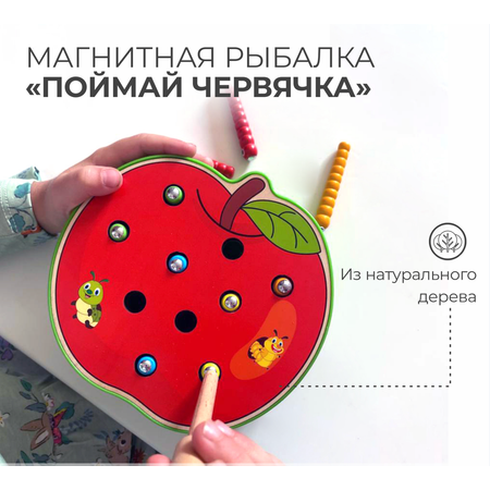 Магнитная рыбалка "Поймай червячка" Яблоко . Самая первая и самая долгоиграющая развивашка для Вашего малыша! Яркий сортер Яблочко обязательно привлечет внимание ребенка и займёт его надолго. Совместную игру можно начинать с момента как малыш сел. Смысл заключается в том, чтобы магнитной палочкой доставать гусениц из яблока. После этого малыш может рассортировать их обратно по лункам, развивая при этом аккуратность и навык вложения. С помощью червячков можно изучать основные цвета и счет в пределах десяти. Магнитная рыбалка поможет Вам развить у вашего ребенка координацию движений, логику, мышление. В ходе игры малыш научится понимать причинно-следственную связь и законы работы магнита.Цены в интернет-магазине могут отличаться от розничных магазинов.