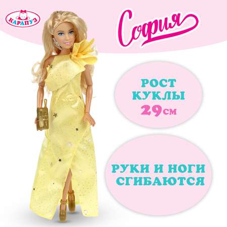 Модница-София одета в роскошное жёлтое платье. Образ куколки дополняют модные крупные серьги и элегантная сумочка. Одежду и аксессуары легко снять и надеть. С такой модной куклой девочке будет интересно и весело играть: благодаря тому, что руки и ноги куклы подвижны, им можно придать любое положение. У Софии длинные красивые волосы, которые хозяйка куклы сможет заплетать в разные причёски. Детально проработанный дизайн игрушки вдохновит девочку на новые игровые сюжеты.