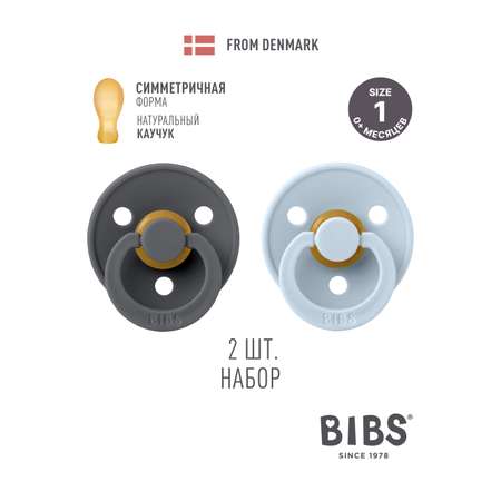 Набор из двух пустышек BIBS Colour с соском симметричной формы из натурального каучука (латекса) и узнаваемой накладкой с тремя вентиляционными отверстиями.