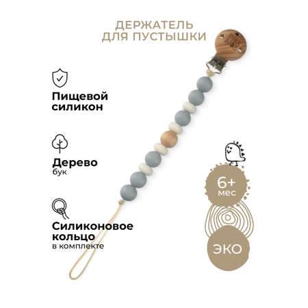 Держатель из бусин, выполненных из пищевого силикона и бука, надежно и бережно крепится к одежде.