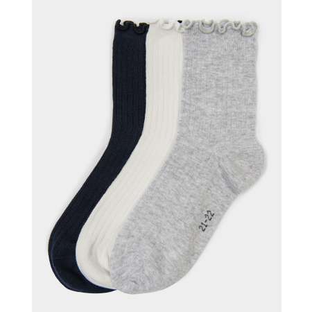 В комплекте Futurino три пары однотонных носков в рубчик для девочки - тёмно-синие, белые и серые.