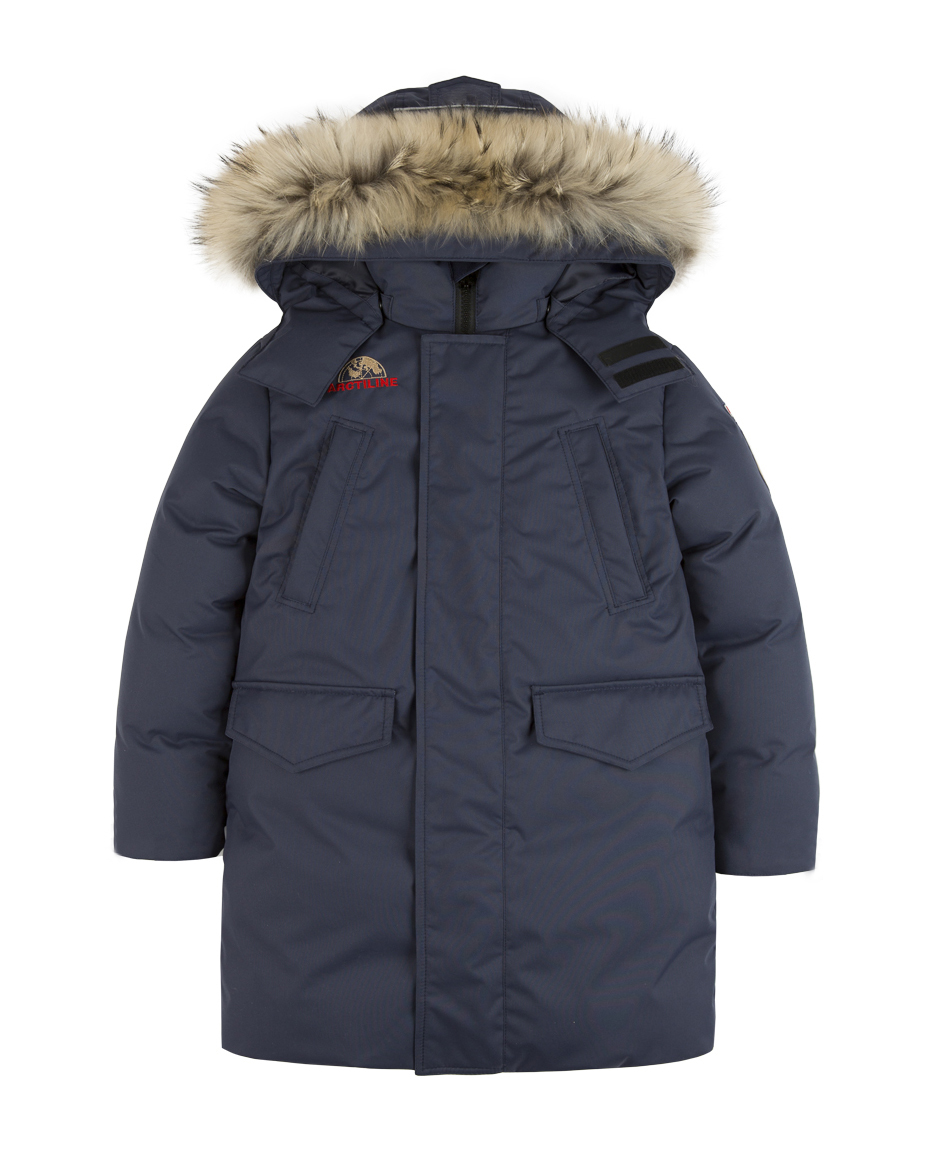 - Пуховая парка застегивается на двухзамковую молнию с клапаном для защиты подбородка, также имеется ветрозащитная планка на липучках «Велкро».