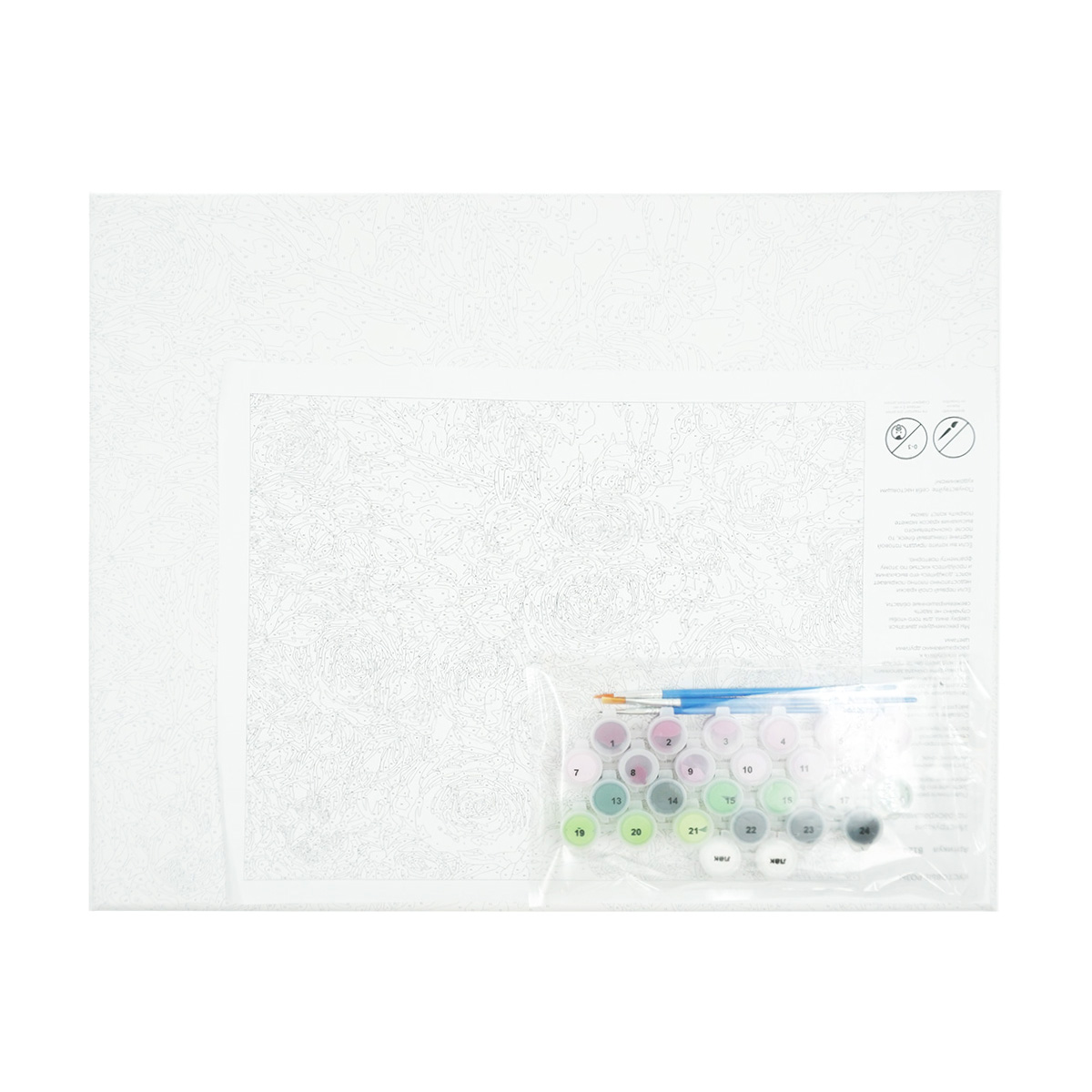 В наборе: акриловые краски в баночках с номерами, грунтованный холст (100% хлопок) с пронумерованными областями для раскрашивания, подрамник, кисти с нейлоновой щетиной (3 шт.), плоский лайнер, финишный лак, контрольный лист, инструкция.
