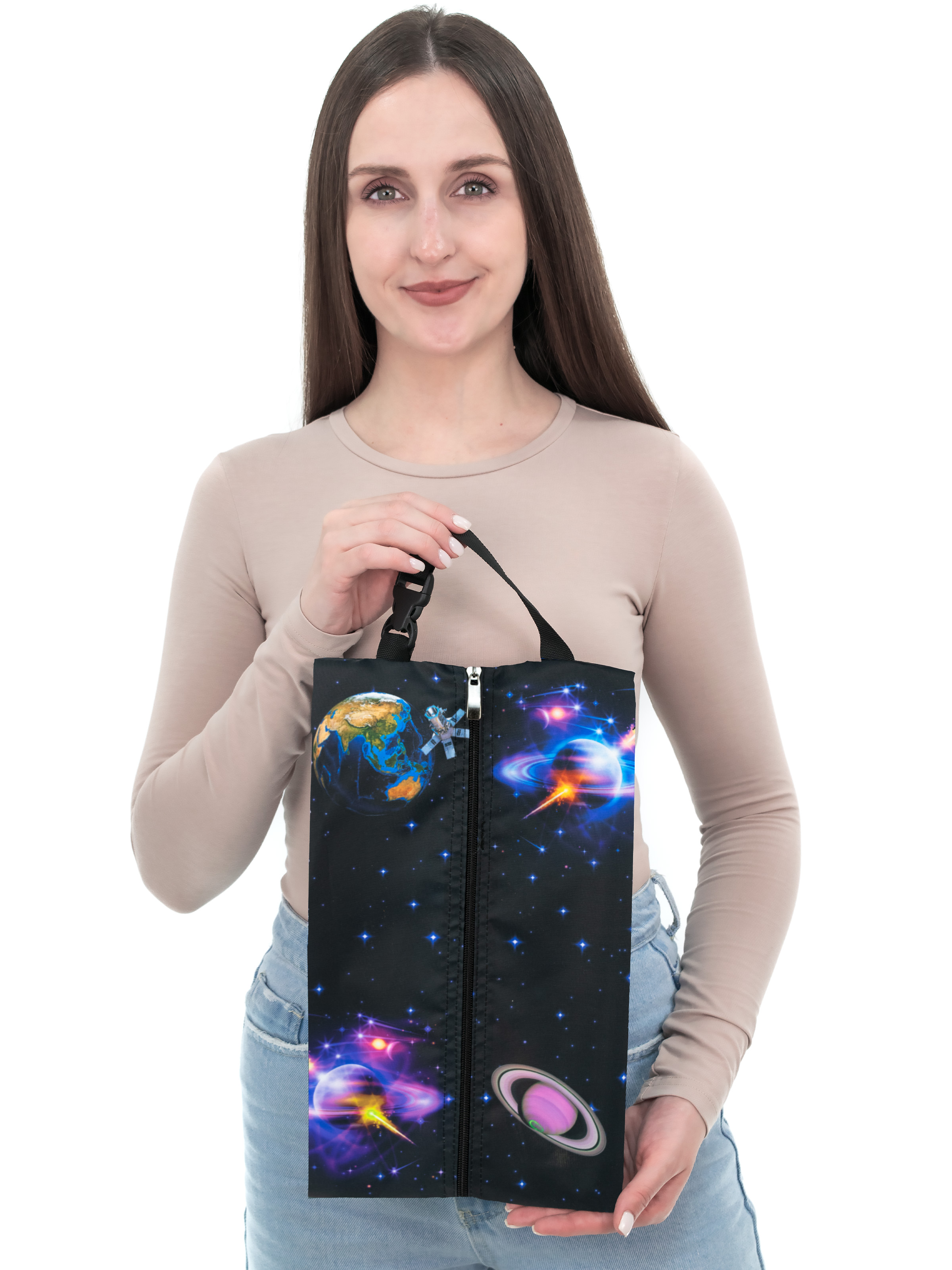 Детский мешок оформлен ярким рисунком с космоса , что делает его привлекательным для маленьких пользователей. Яркая расцветка помогает выделиться среди других рюкзаков и сумок, а стильный дизайн подойдет как подросткам, так и малышам. Этот большой чехол также будет уместен на занятиях балетом или гимнастикой — все необходимое всегда под рукой!