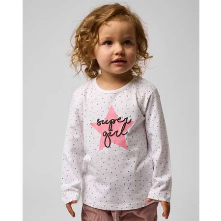 Белый лонгслив для девочки Baby Go, с принтом в горошек и надписью "super girl".