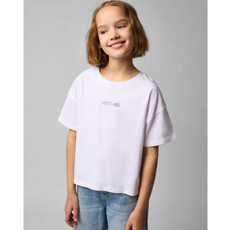 Укороченная футболка для девочки Futurino белого цвета с надписью.