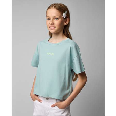 Укороченная футболка для девочки Futurino зелёного цвета с надписью.