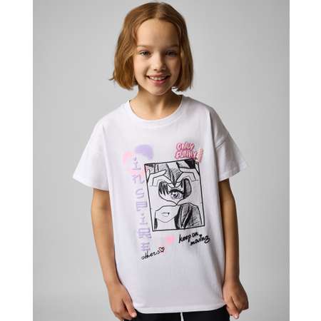 Белая футболка для девочки Futurino с цветным принтом в стиле аниме, украшенным блёстками.