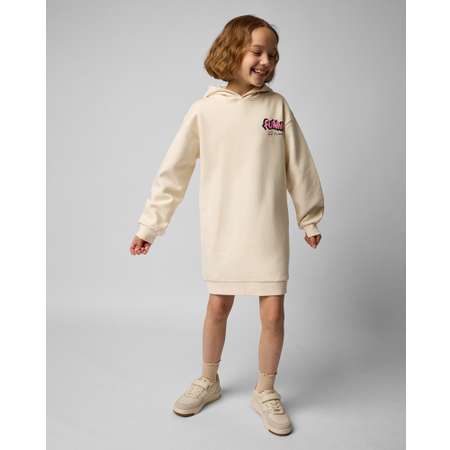 Платье-толстовка для девочки Futurino молочного цвета. На спинке декорировано принтом с блестящими элементами.