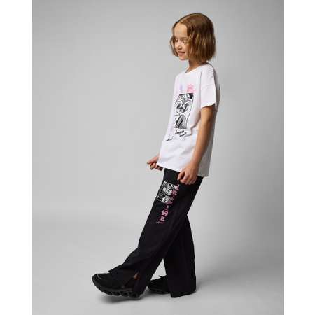 Чёрные широкие брюки для девочки Futurino с ярким принтом в стиле аниме и разрезами по низу.