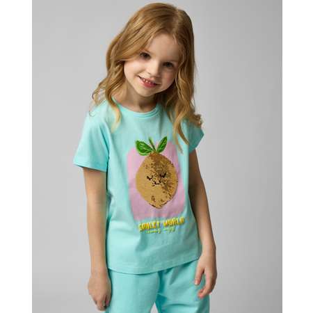 Ярко-голубая футболка для девочки Futurino с цветным принтом и декором из двусторонних пайеток.