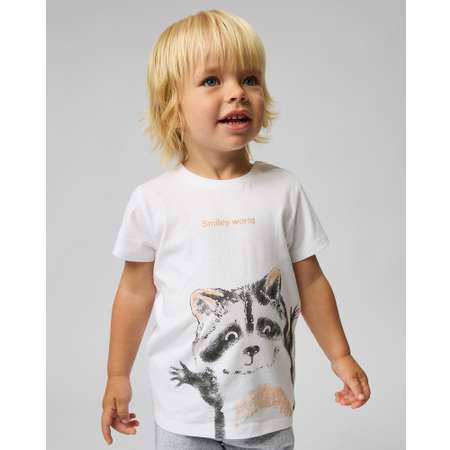 Белая футболка для мальчика Baby Go, декорированная принтом с очаровательным енотом.