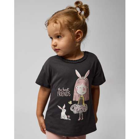 Тёмно-серая футболка для девочки Baby Go Trend, декорированная цветным принтом с блёстками.