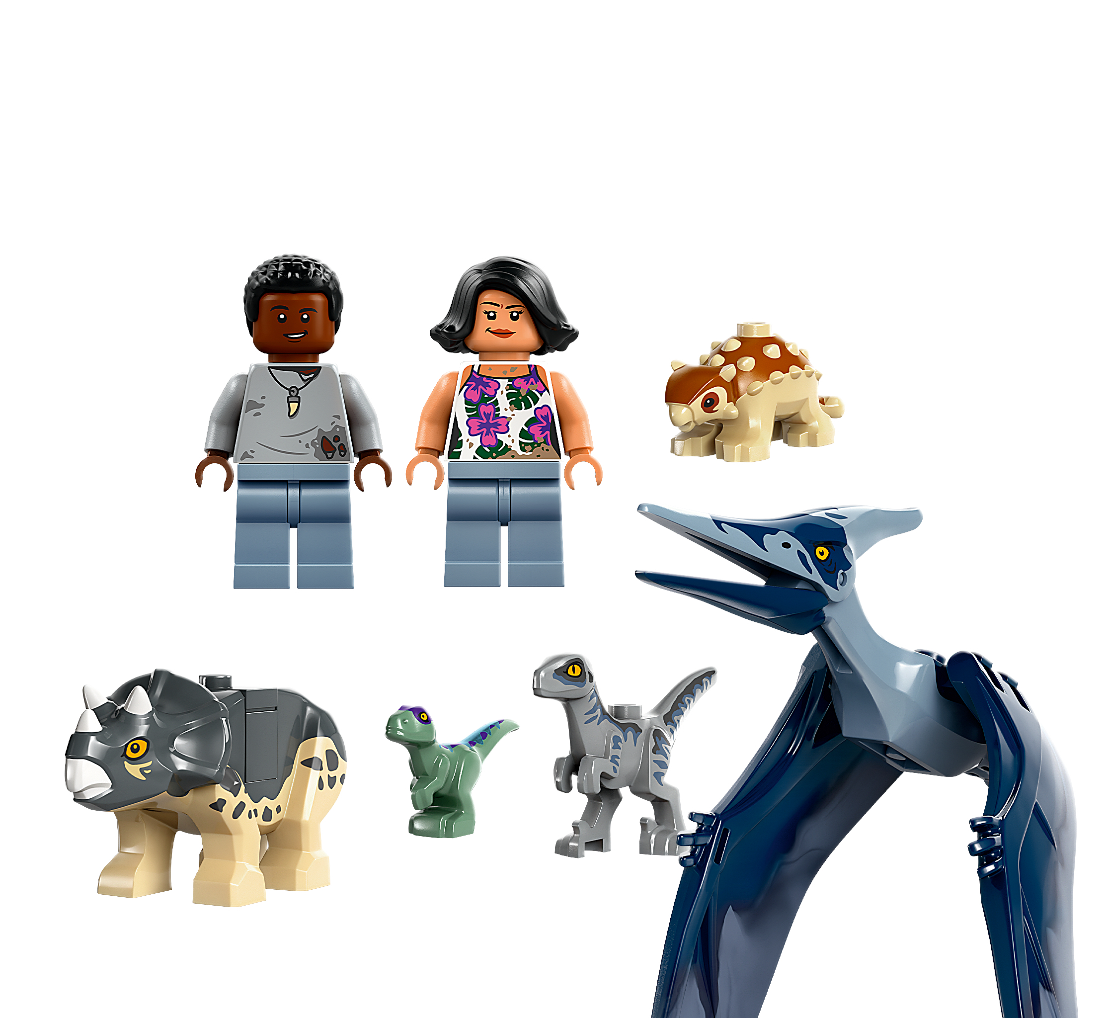 Комплект включает в себя внедорожник и исследовательскую зону с солнечными батареями, стену пещеры, а также станцию кормления. Две минифигурки Дариуса и Сэмми, фигурки детенышей Анкилозавра, Трицератопса и Велоцираптора, Велоцираптора и взрослого Птеранодона.