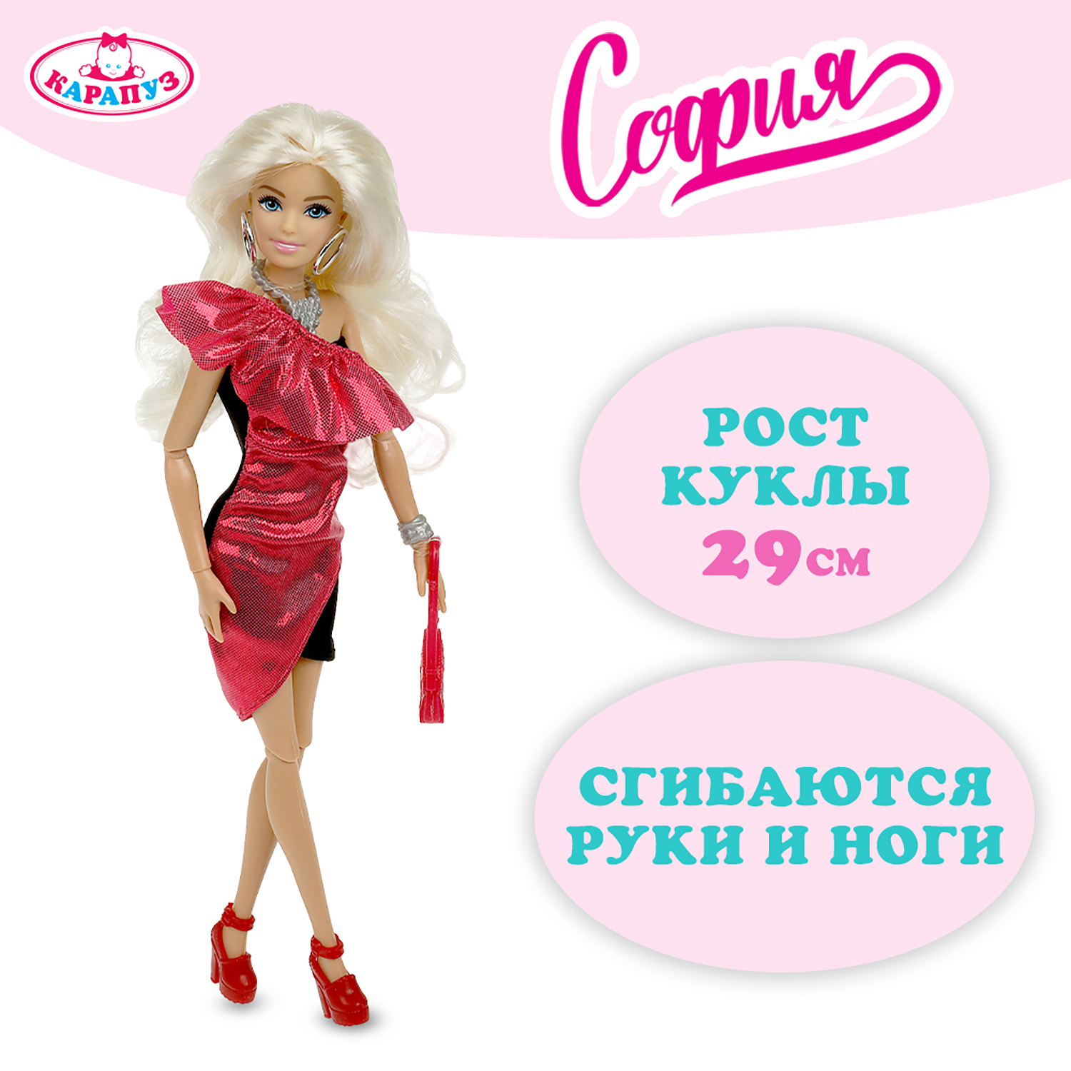 Модница София одета в стильное чёрно-розовое платье, образ дополняют крупные серьги, ожерелье, браслет и яркая сумочка. Одежду и аксессуары легко снять и надеть. С такой модной куклой девочке будет интересно и весело играть: благодаря тому, что руки и ноги куклы подвижны, им можно придать любое положение. У Софии длинные волосы, которые хозяйка куклы сможет заплетать в разные причёски. Наличие дополнительных аксессуаров в наборе сделает игры с куклой более разнообразными и интересными. Игра с куклой ТМ «Карапуз» развивает: