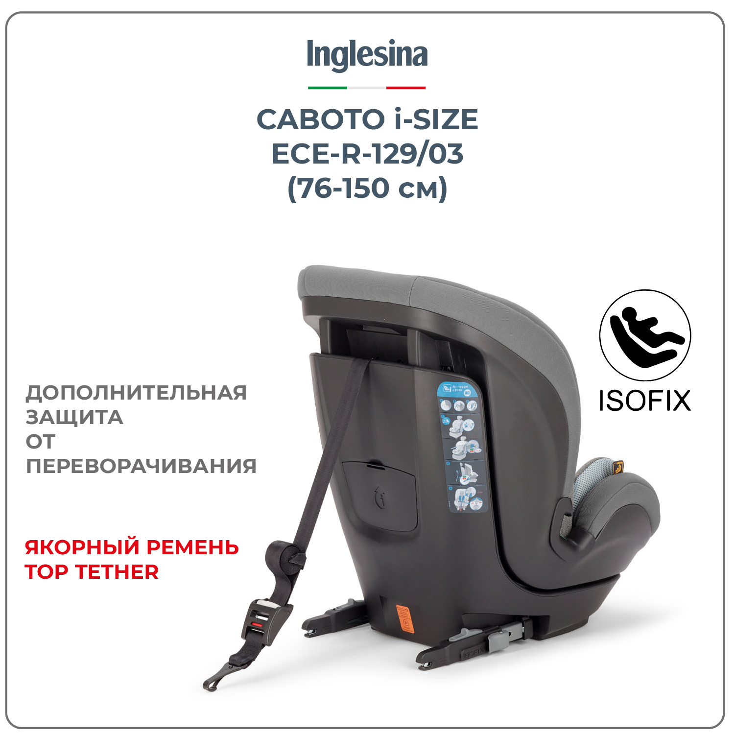 Автокресло Caboto i-Size (от года до 12 лет) Стандарт ECE R129/03 Основные преимущества • Автокресло, которое обеспечивает безопасные поездки вашего ребенка до достижения им роста 150 см (ориентировочно до 12 лет). • База входит в комплектацию. Размеры и вес Внутренняя ширина спинки: 34 см Внутренняя высота спинки: 53-74 см Внутренняя ширина сиденья: 31 см Вес: 13.2 кг Внешние размеры автокресла: 43 x 64-83 x 57 см Безопасное путешествие с рождения • Для максимально комфортных путешествий с брендом «Инглезина» • Автокресло Caboto i-Size cертифицировано согласно европейскому стандарту ECE R129/03 для детей ростом от 76 и до 150 см. Установка • При росте ребенка от 76-105 см- со встроенными ремнями безопасности автокресла + креплениями Isofix + Top Tether • При росте ребенка от 105-150 см- с ремнями безопасности автомобиля + креплениями Isofix Комфорт и безопасность Оборудовано системой боковой защиты от ударов Side Head Protection (SHP) для максимальной безопасности ребенка. Эргономичная форма, просторные внутренние размеры и угол наклона спинки делают модель невероятно удобной для малыша. 4 положения угла наклона спинки для максимального комфорта в кратковременных или продолжительных поездках. Подголовник регулируется в 9 положениях для предоставления максимального комфорта ребенку на всех этапах его роста – автокресло растет вместе с ребенком. Чехол выполнен из премиальных тканей: износостойкие роскошный меланж и плотное джерси, мягкие накладки на ремни и анатомический вкладыш для максимального комфорта маленького пассажира. Чехол детского автокресла легко снимается, рекомендована деликатная стирка при температуре 30°C.Цены в интернет-магазине могут отличаться от розничных магазинов.