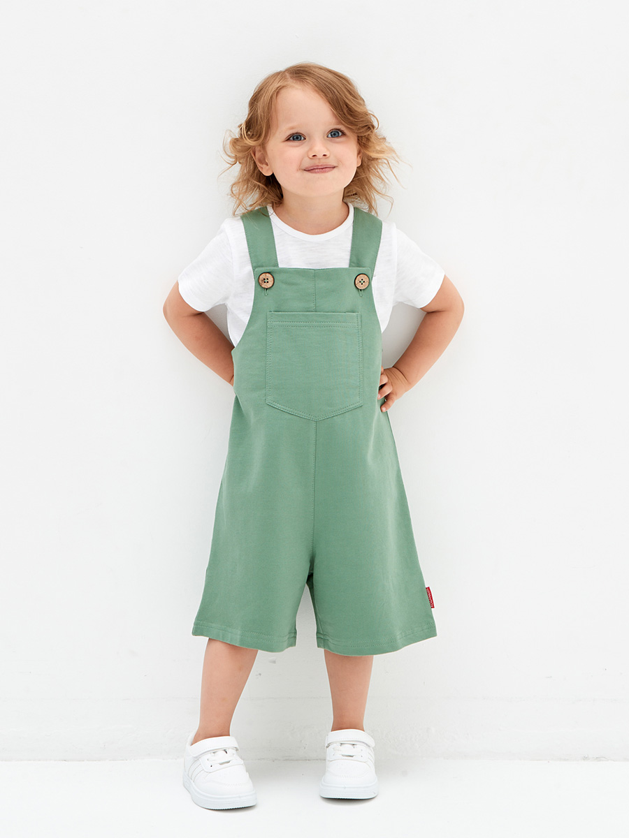 Полукомбинезон с шортами на лямках для девочки имеет удобную застёжку на пуговицы и передний накладной карман.