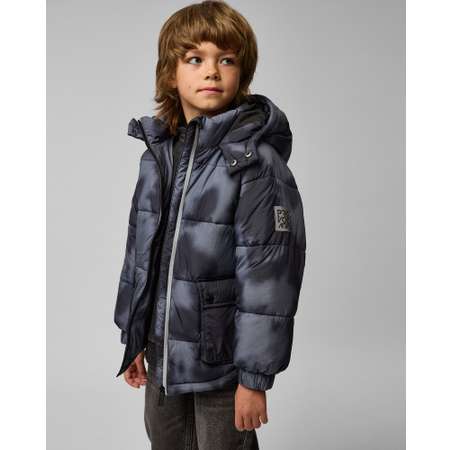 Стёганная куртка для мальчика Futurino Fashion тёмно-серого цвета с принтом "тай-дай". Дополнена светоотражающей молнией и нашивкой.