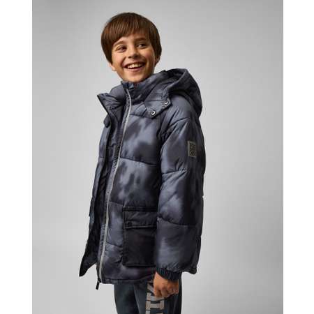 Стёганая куртка для мальчика Futurino Fashion тёмно-серого цвета с принтом "тай-дай". Дополнена светоотражающей молнией и нашивкой.