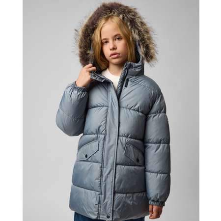 Стёганое зимнее пальто для девочки Futurino голубого цвета. Декорировано нашивкой с голографическим эффектом.