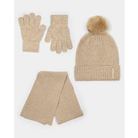 Бежевый комплект для девочки Futurino из перчаток, шарфа и шапки с помпоном из искусственного меха.