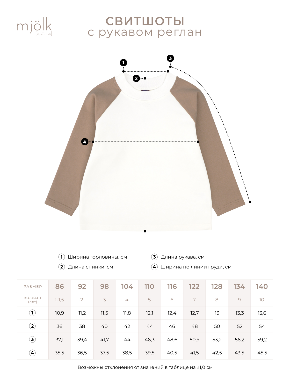 Свитшот Mjölk с рукавом реглан подарит уютный и стильный образ, дополнить который можно брюками, легинсами в сопутствующих товарах. Однотонная кофточка с длинным рукавом — идеальный вариант на весну и осень. Детский свитшот сшит из хлопка с добавлением лайкры, мягкого и устойчивого к носке и стирке материала. Принт сохраняет первоначальный вид даже после многочисленных стирок. Соблюдайте рекомендации по уходу, указанные на ярлычке. Свитшот упакован в нежный фатиновый мешочек с лентой и станет отличным подарком любому, у кого в семье есть малыш. Продукция mjölk [мьёльк] сертифицирована, соответствует Техническому регламенту Таможенного союза EAC, прошла государственную регистрацию. В связи с особенностями производства партий полотна на фабриках, оттенки цветов могут различаться. В связи с разными техническими характеристиками мониторов цвет товара может отличаться от представленного на сайте.
