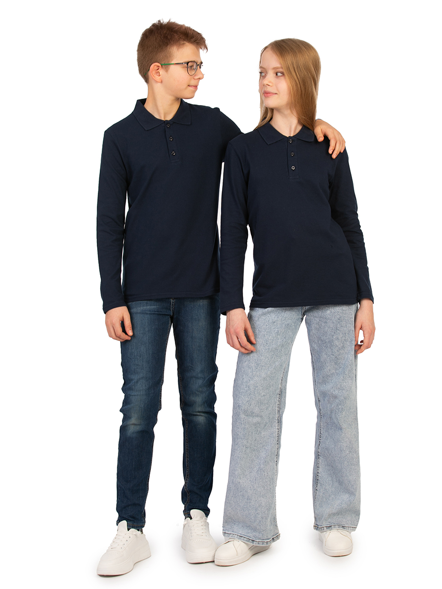 Футболка для мальчика поло для мальчика из ПИКЕ с длинным рукавом темно-синего цвета классического прямого кроя.