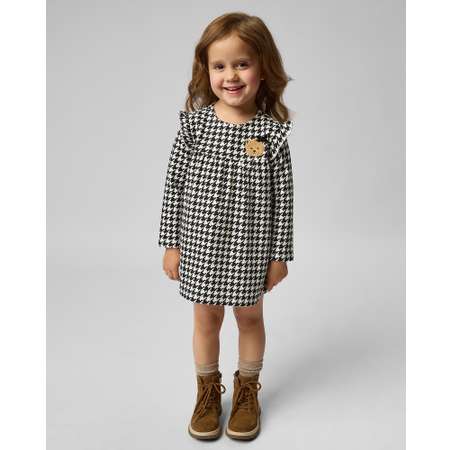 Платье для девочки Baby Go с принтом "гусиная лапка" и оборками. Дополнено объёмным декором в виде медвежонка.