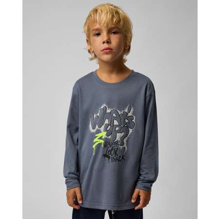 Синий лонгслив для мальчика Futurino с цветной надписью в стиле граффити.