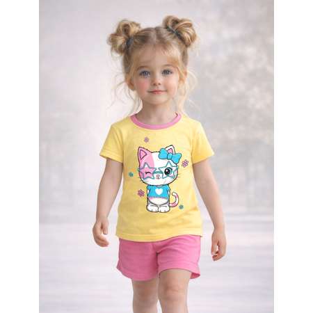 Костюм - футболка с шортами, выполнен из экологичной хлопковой ткани-кулирное полотно.Футболка прямого кроя. Вырез горловины округлый, выполнен из эластичной ткани рибана, рукав втачной, короткий. Полочка декорирована тематическим принтом .Трикотажный комплект футболка и шорты отлично подойдет для детей на лето как повседневная одежда. Футболки с яркими, красивыми и разнообразными принтами. Очень удобные шорты с мягкой резинкой. Костюм с шортами для девочки легко стирается, не теряет цвет и форму, не скатывается. Детские костюмы для девочки из хлопка гипоаллергенны и хорошо пропускают воздух, поэтому в жаркий летний день в таком костюме будет очень комфортно и не жарко.