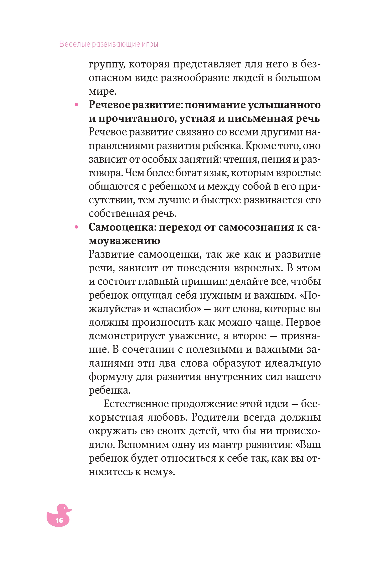 В этой книге вы найдете множество научно обоснованных описаний игр для детей от рождения до трех лет. Для каждой игры приведены инструкции, перечень необходимых материалов и подкрепленное исследованиями описание преимуществ, которые она дает. Все описанные в книге игры стимулируют развитие в одном или нескольких из пяти направлений: когнитивном, моторном, социально-эмоциональном, речевом и самооценки. Каждая игра помогает ребенку освоить какие то навыки. Некоторые из них, вероятно, покажутся вам знакомыми, так как они основаны на самых традиционных играх. Некоторые из них, рассчитаны на то, чтобы вы видоизменяли и додумывали их сами. И во все перечисленные в книге игры вы можете играть по своему.