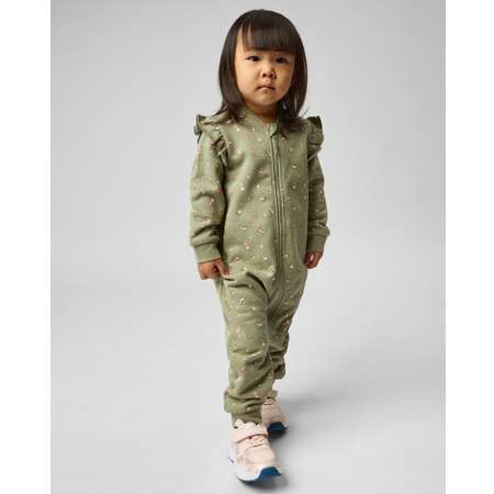 Зелёный комбинезон для девочки Baby Go с оборками и цветочным принтом.