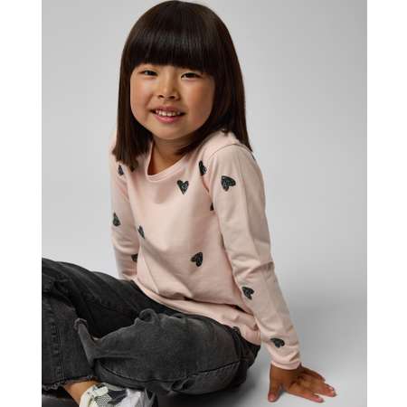 Бежевый лонгслив для девочки Futurino, декорированный принтом с сердечками.