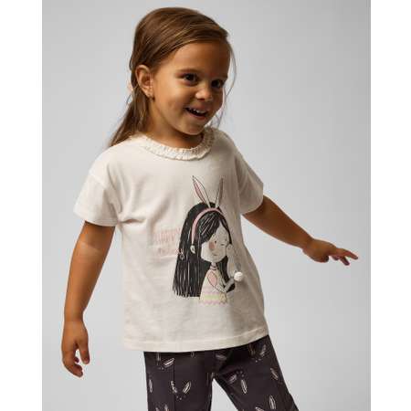 Бежевая футболка для девочки Baby Go Trend с принтом, декорированным блёстками и объёмным элементом помпоном). Украшена оборками на вороте.