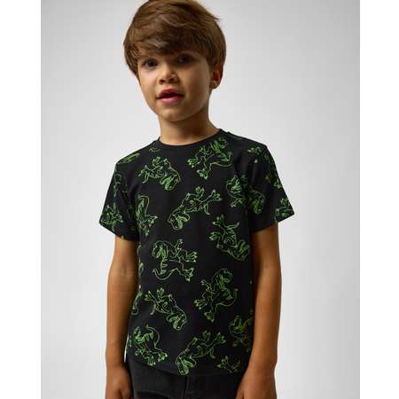 Чёрная футболка для мальчика Futurino, декорированная ярким принтом с динозаврами.