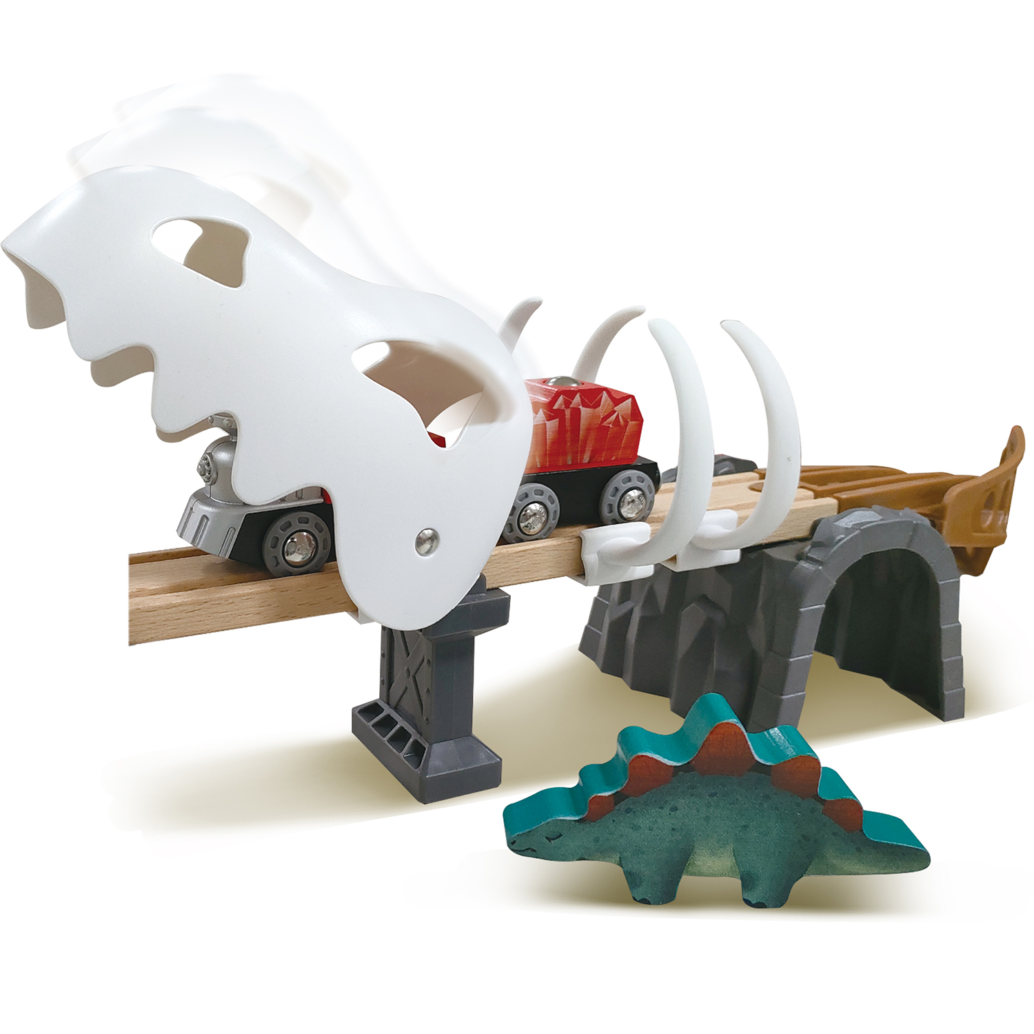 Игровой набор деревянная железная дорога для малышей «Парк динозавров» с элементами, светящимися в темноте, 61 деталь.
