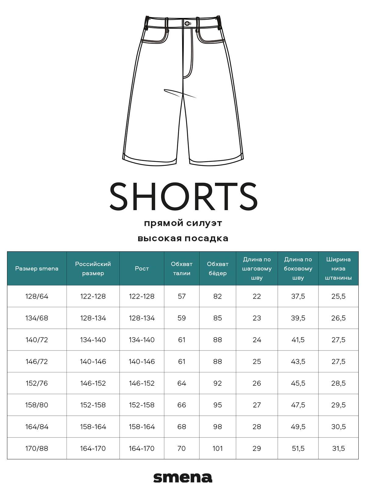 Уважаемые покупатели, в графе "Размер smena" указан рост (первая цифра) и обхват груди (вторая цифра). Для более правильного выбора размера шорты детские, пожалуйста, обращайте внимание на эти два параметра. По Российским ГОСТам размер детской одежды равен объему груди, даже для поясных изделий, для того, чтобы определить объем талии и иные обхваты необходимо смотреть соответствие объему груди.