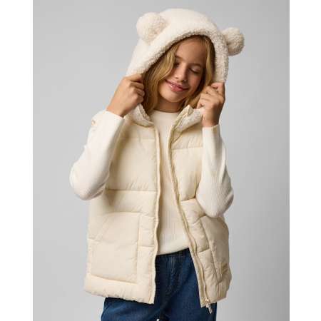 Стёганый жилет для девочки Futurino Cool, дополненный плюшевым капюшоном с ушками. Декорирован нашивкой.